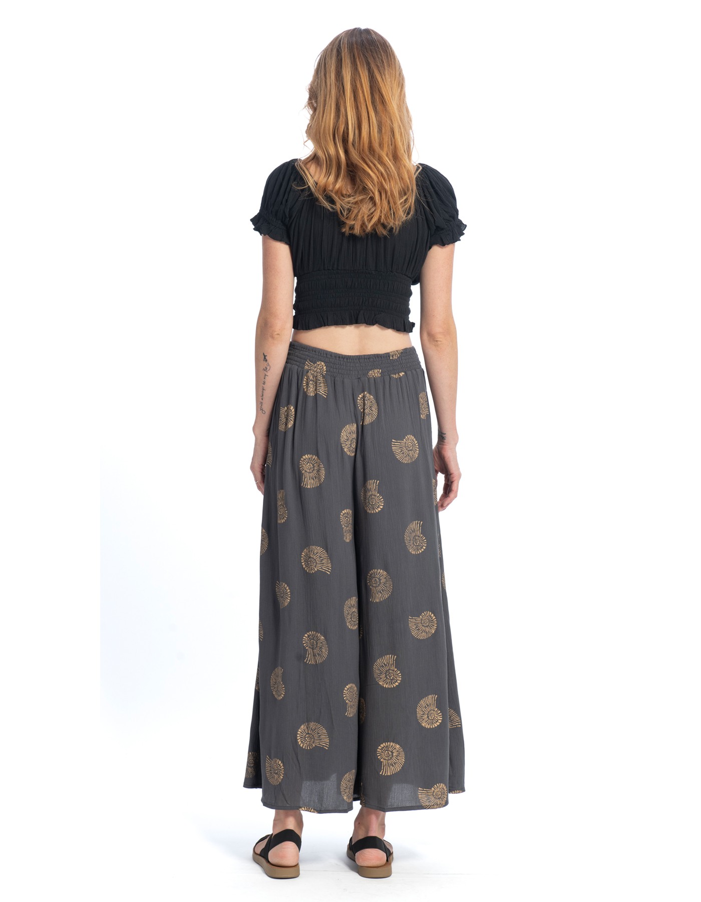 The Phoenix Pants have a wide, flowy leg, a 2″ elastic waistband, and pockets.
