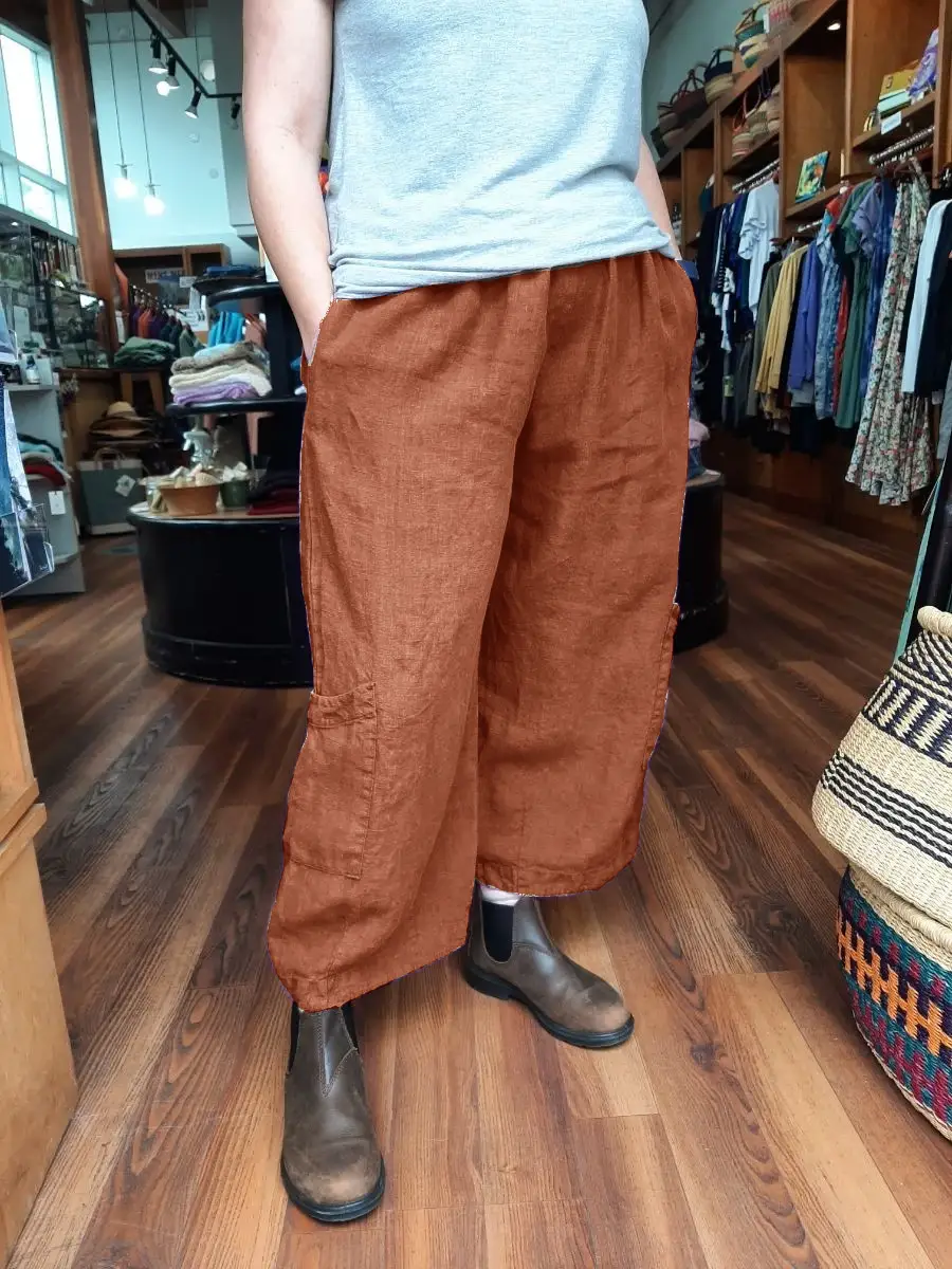 Bryn Walker’s most popular summer pant. Sporty style that is 100% light weight linen. Cropped length with low side pockets. Full elastic waist with side slit pockets.