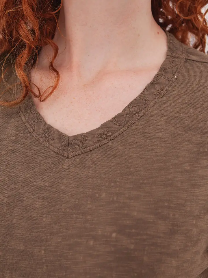 The Layla Organic V-Neck Top is the updated version of an Old Ranch Brands classic, the Bryce V-Neck Top. Customers loved the soft cotton, flattering fit, and embroidery detail along the neck of the Bryce but we’re sure you’ll love our improvements even more! This top is still 100% cotton, but upgraded to the more environmentally-friendly organic cotton. The fabric was also altered to be a slub jersey which has enhanced softness, better handfeel, and a beautiful heathered appearance. Slub jersey has a great stretch to it without the use of synthetic fibers like spandex. Finally, the Layla Organic V-Neck Top made an ethical upgrade; it is produced at a Fair Trade Factory™!