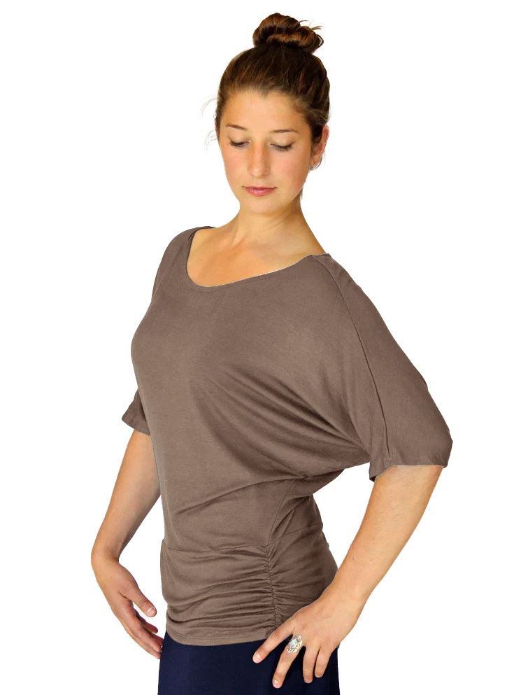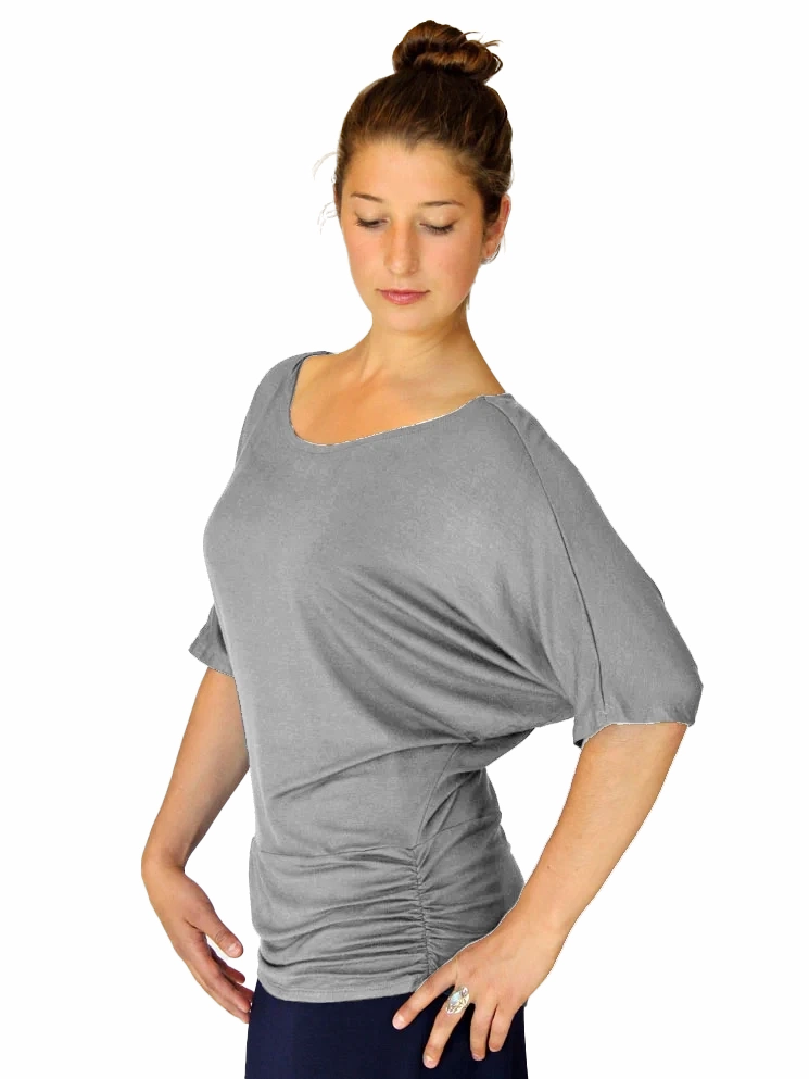 Wide neck, half sleeved, dolmen top. Side ruching over the hips makes this top flattering on many body types.
